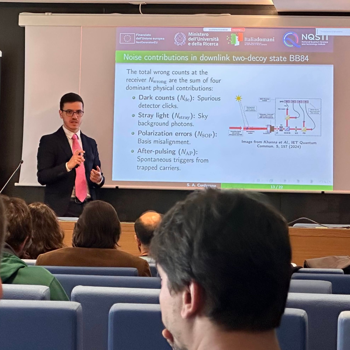 • Dott. S. A. Cordovana, Modeling phenomena affecting the QBER in satellite-to-ground links and developing performance-verification software (Academic supervisor: Prof.ssa Elisabetta Paladino; Industrial supervisors: Dr.ssa M. Ottavi, Dr. M. Savaresi, Dr. M. Valeri – Thales Alenia Space Italy)