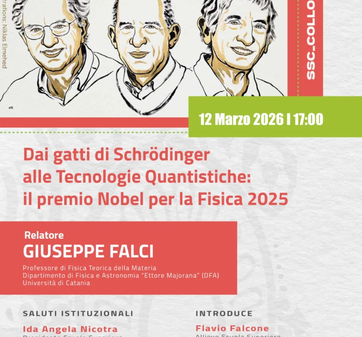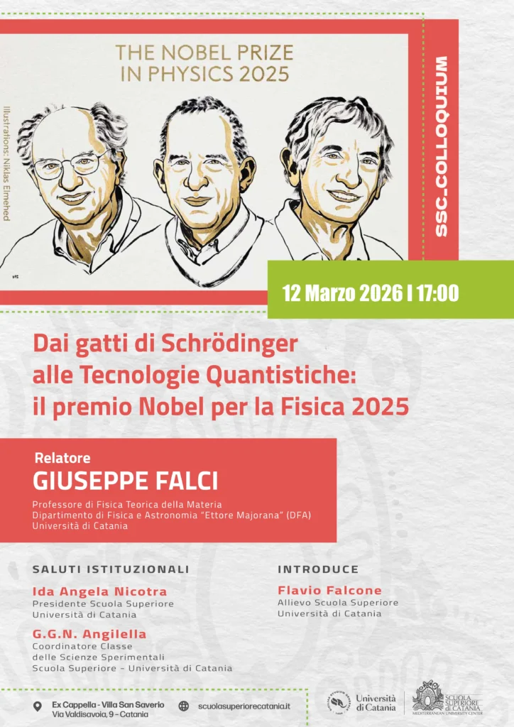 Giorno 12 marzo 2026, con inizio alle ore 17:00, presso la Scuola Superiore di Catania, il Prof. Giuseppe Falci (DFA UniCT) terrà un SSC Colloquium dal titolo Dai gatti di Schrödinger alle Tecnologie Quantistiche: il premio Nobel per la Fisica 2025.